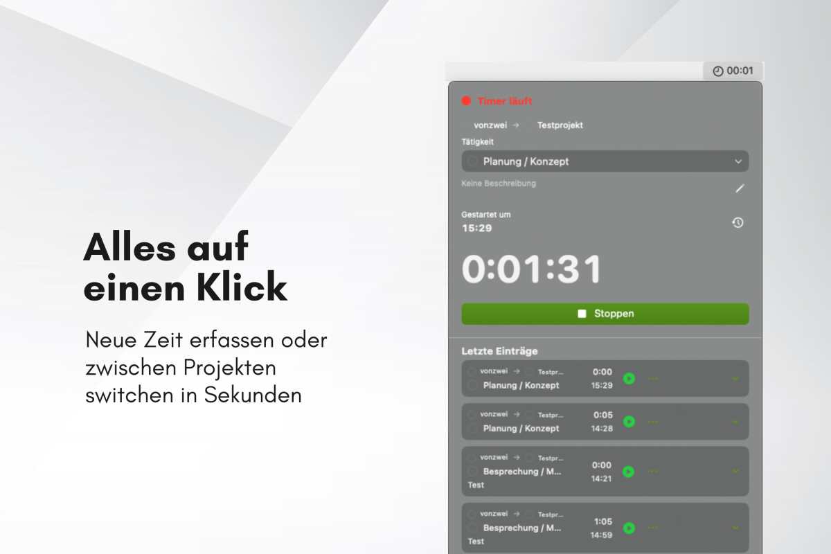 Timer starten, stoppen und wechseln – ohne den Browser zu öffnen.