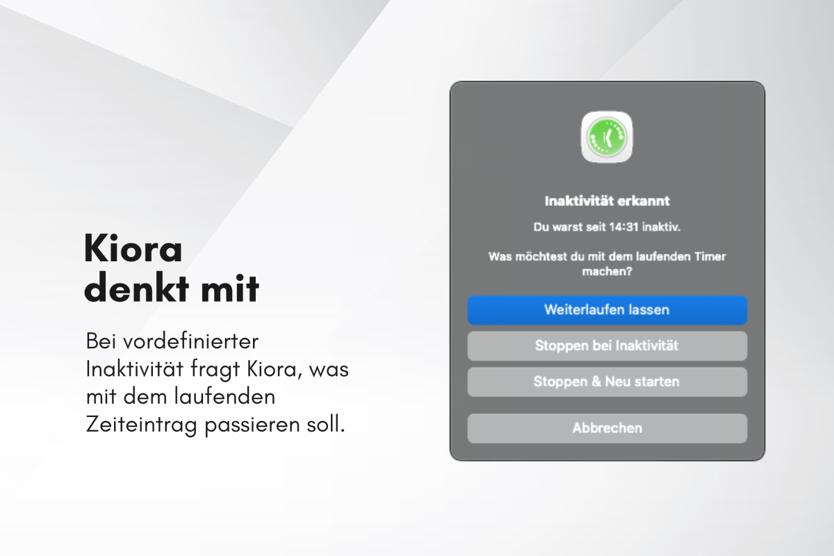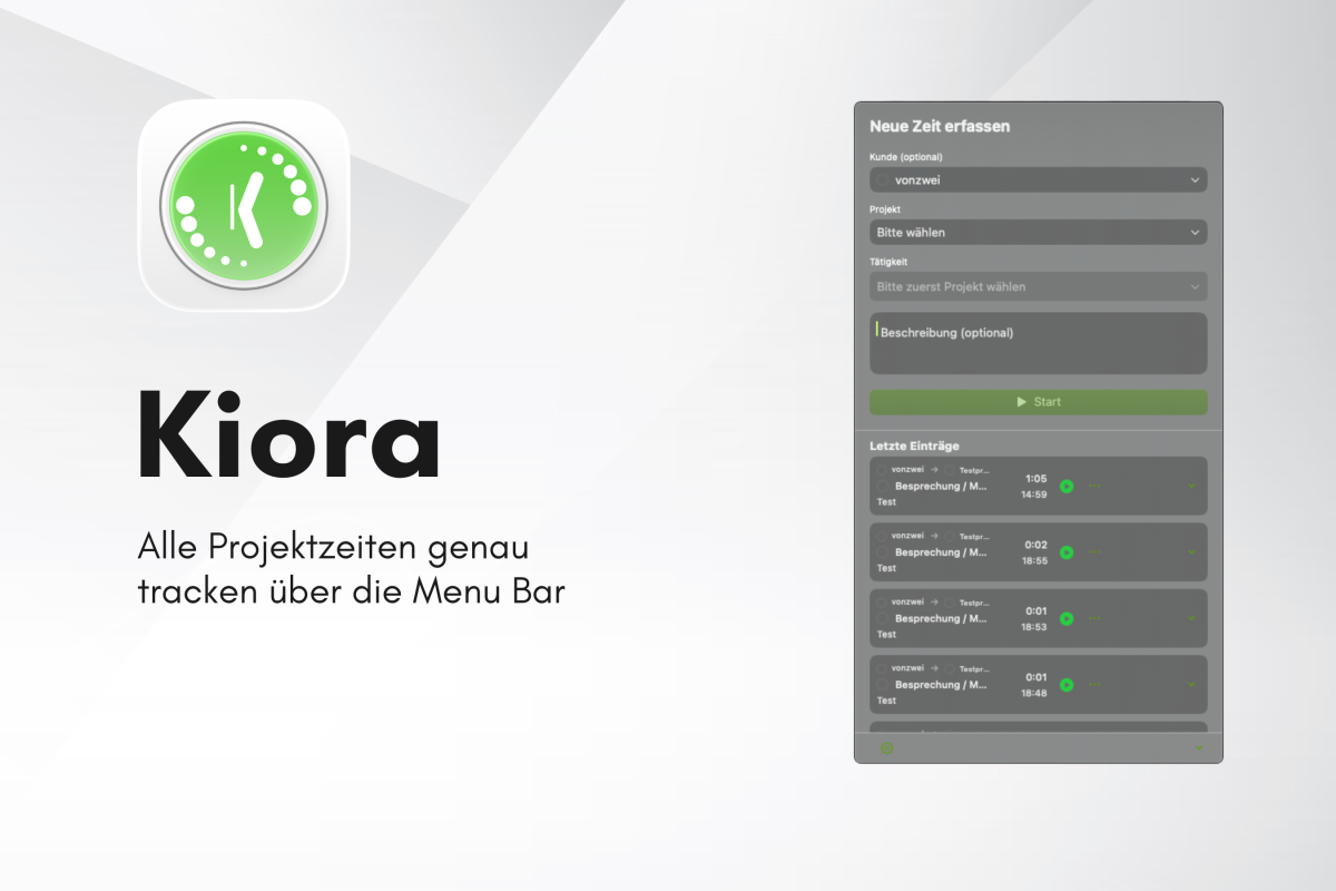 Kiora verbindet sich mit deinem Kimai und bringt Zeiterfassung dorthin, wo du arbeitest – direkt in die macOS-Menüleiste. Kostenlos.